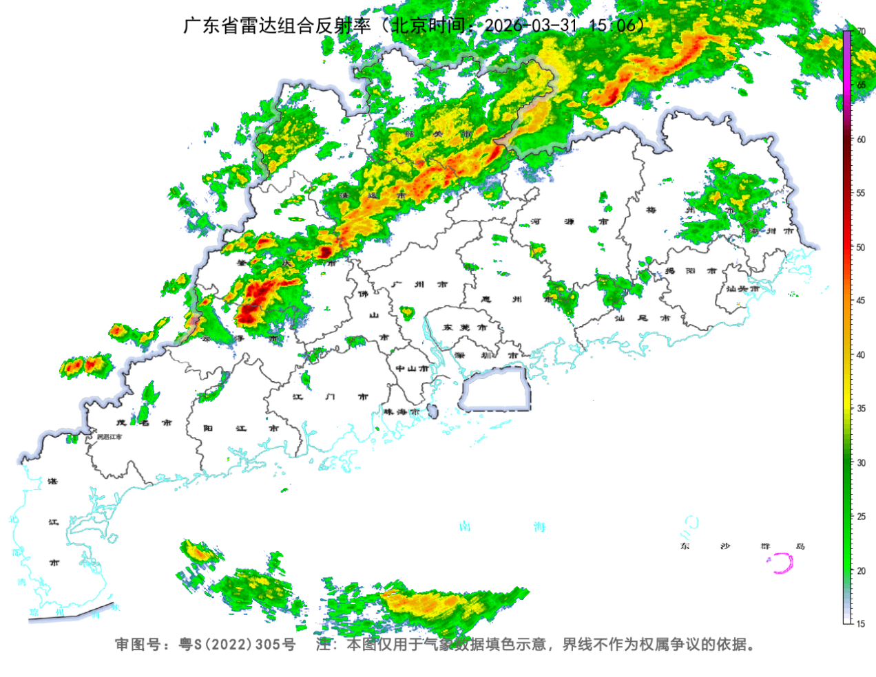 截至31日15时12分,从天气雷达回波图看,又有一条呈“东北—西南”走向的雷雨云,肇庆、清远、韶关等地部分市县雨势较强。