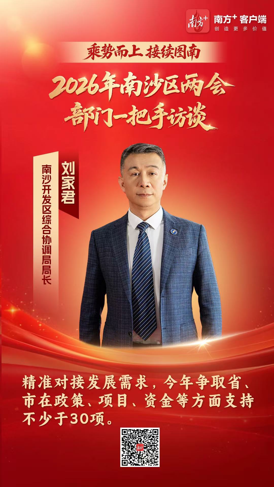 刘家君:2026年既是“十五五”开局之年,也是《南沙方案》第二阶段的开局之年。我们将以落实《南沙方案》为总牵引,紧紧围绕打造中国式现代化样板区的总目标,进一步激发“跳一跳”的改革精神和担当劲头,扎实推进省南沙工委各项任务落地落实。